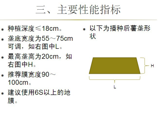 ① 该马铃薯种植机适用于土壤含水率20%以下,且耕整后较平整、无石块、障碍物的地块种植作业。