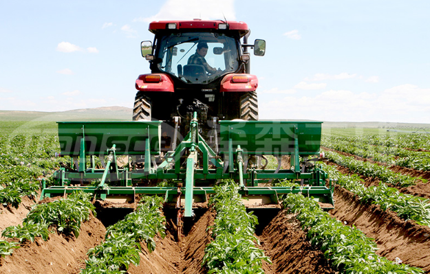 马铃薯中耕起垄施肥机是用于马铃薯中耕培土的农业机械,可完成松土、除草、筑垄、追肥等作业,同时兼有提高地温、保墒作用。该种犁体采用新型的犁体曲面结构,非常适合北方寒冷地区的起垄作业,尤其适合块茎类作物的中耕作业,垄体截面上小下大中间外鼓,垄体外形光滑整齐,单垄储存块茎能力增大,该垄体具有抗旱、保墒、保温、增产等效果。犁壁采用独特的犁体曲面设计,使犁体的受力面更合理,作业阻力更小,双侧犁壁宽窄可调,可控制垄体大小,该犁体的犁壁下部采用内收的形式,使得中耕作业过程中块茎不会被划伤,同时垄体覆盖严密,使块茎不易露出地面,对块茎的生长发育极为有利。