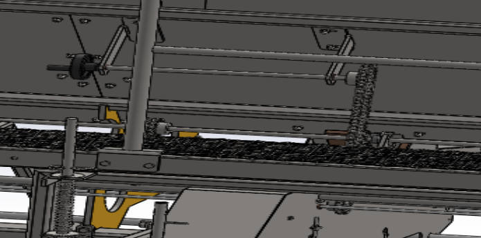 4. 播种单元振动板的宽窄通过上面这个旋转把手来调节。旋转把手带着链轮,链轮通过链条带动下面的链轮,下面的链轮通过与螺纹块的距离的改变,来调节播种单元的播种大小,宽窄。